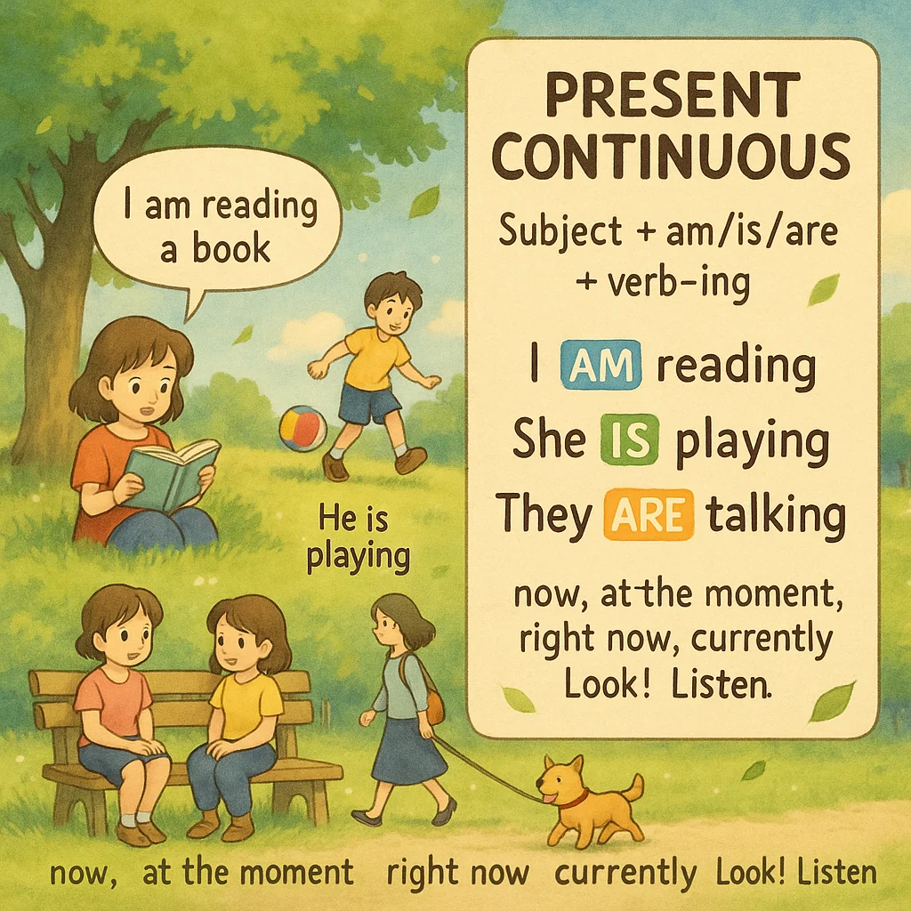 - I am reading a book now. (Я читаю книгу сейчас.)