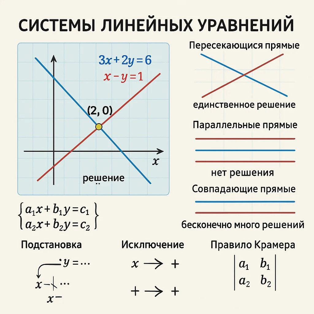 В случае системы двух уравнений с двумя неизвестными каждое уравнение представляет собой прямую на плоскости. Возможны три случая: