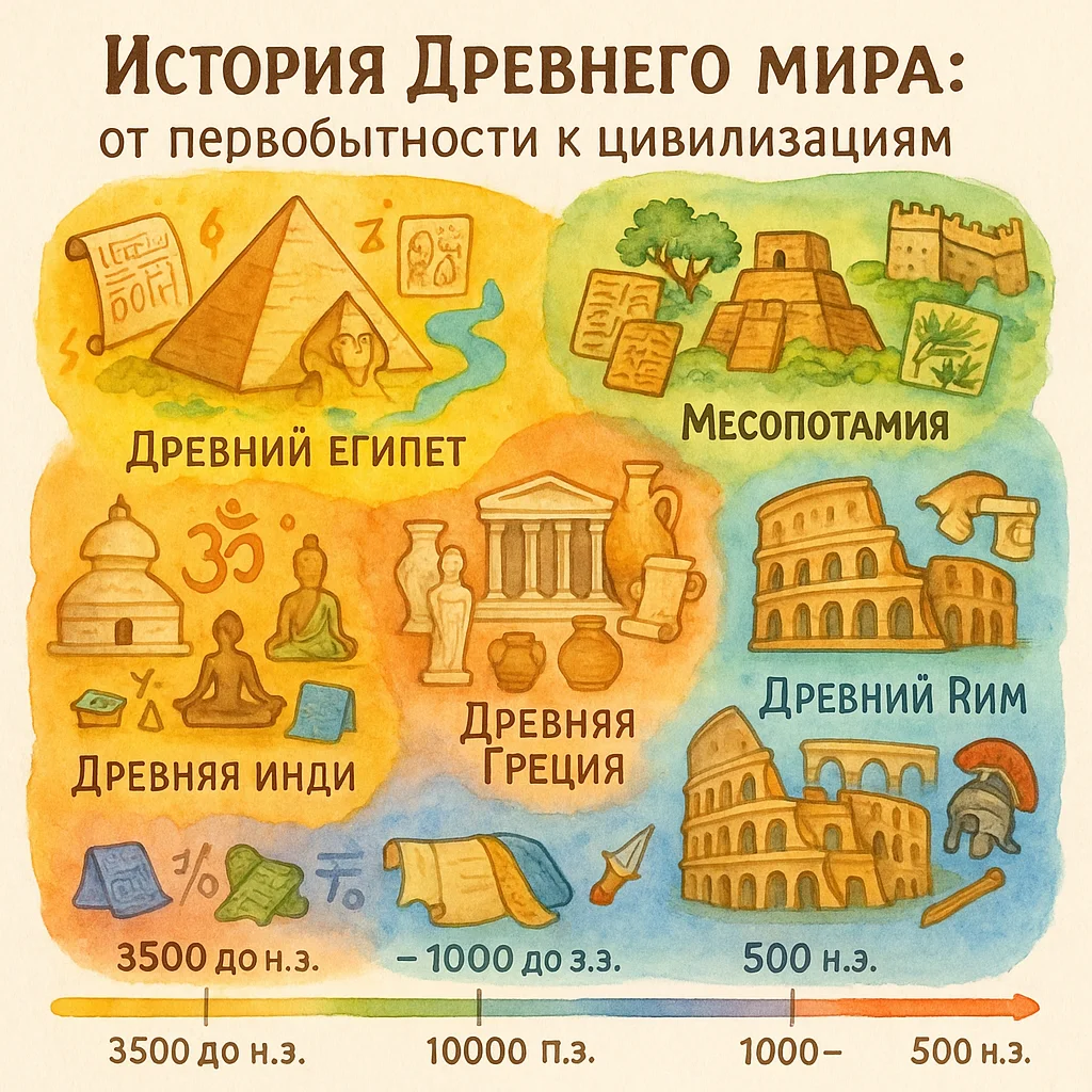 История Древнего мира охватывает период примерно от 3000 г. до н.э. до 476 г. н.э. (падение Западной Римской империи) и делится на несколько ключевых этапов: